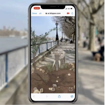 Smartphone displaying an augmented reality scene of an elephant on a city sidewalk, with trees, a lamppost, and people in the background.