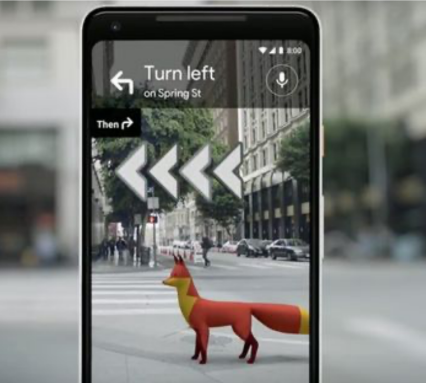 Smartphone displaying GPS navigation with a 'Turn left on Spring St' instruction over a city street scene with a cartoon fox overlay.